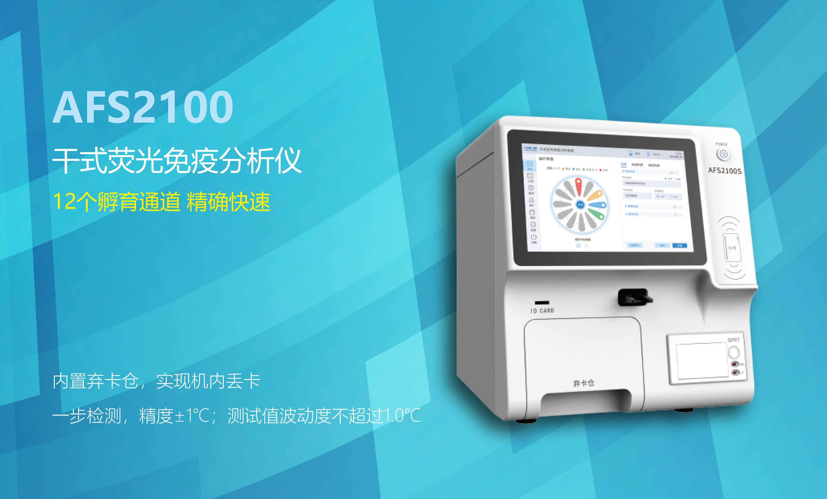 全新的UI設計界面 | 12個獨立孵育通道 | 內置試劑卡棄卡倉 | 自動感應試劑卡插入、自動丟卡 | 內置熱敏打印機自動打印檢測結果